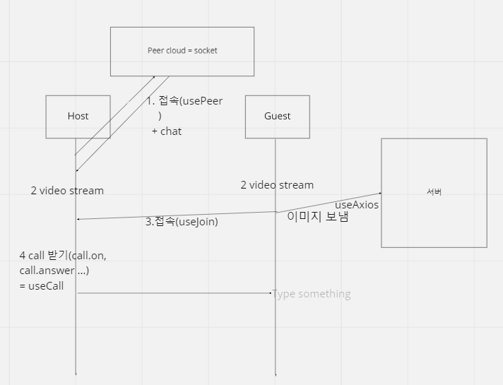 1. 가장 먼저 host에서 peerjs 서버에 접속해서 peer object를 생성한다. 이 과정에서 peer id를 받아서 peer.id에 저장해둔다. 추후 이 아이디를 통해 guest가 웹 페이지에 접속을 할 것이다. (즉, peer.id = Zoom 회의실 링크, 혹은 구글 미트 URL 이라고 생각하면 쉽다.) host는 id를 받아오면 connection을 기다리는 상태가 된다.