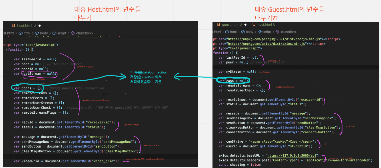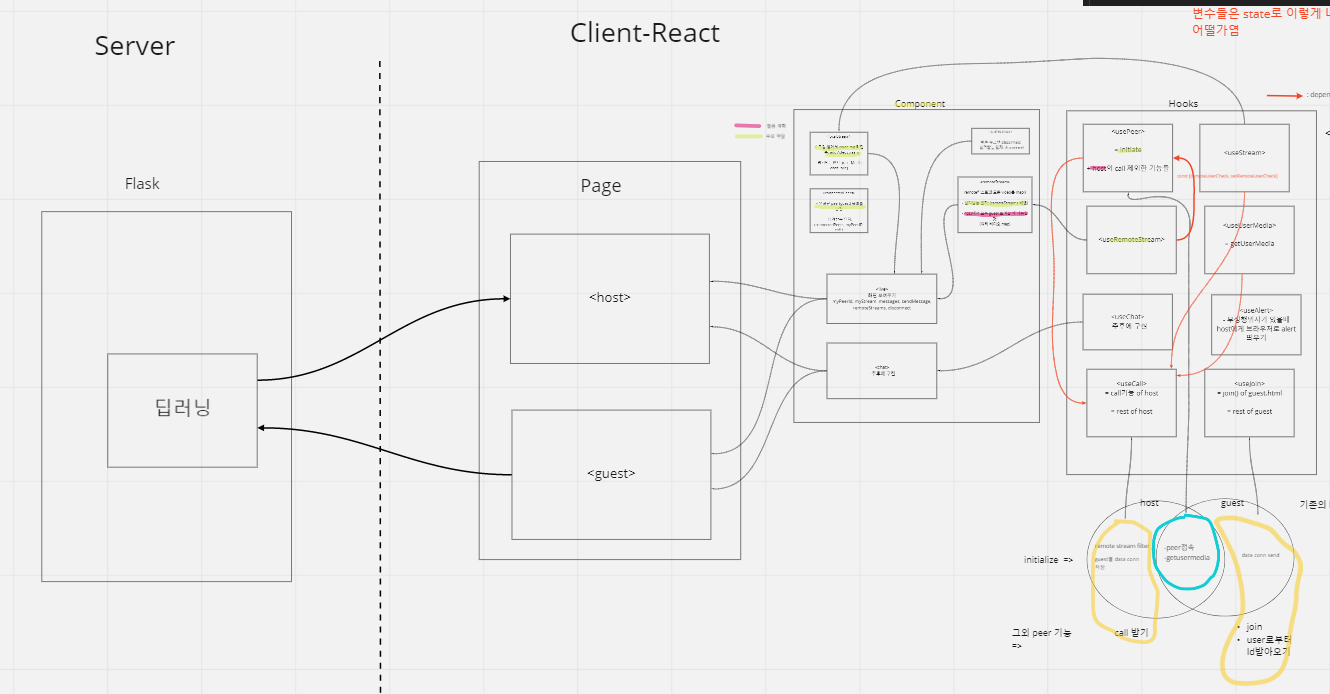 기존에는 nodejs와 express, react를 사용해서 개발을 했었는데 코드가 너무 복잡해지고, 파이썬으로 구성된 딥러닝 부분과 nodejs의 자바 스크립트 코드를 합치기가 어려워서 코드를 모두 flask로 옮기는 작업을 하였다. 최종적으로 host 쪽 웹 페이지와, guest 웹 페이지를 따로 구현하고, flask를 통해 딥러닝 코드를 연결시켰다.