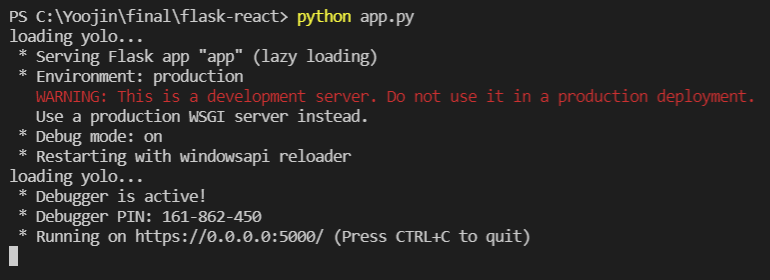 만약 localhost에서 실행시키고 싶으면 127.0.0.1로 하면 되지만, 우리의 프로젝트는 다른 기기에서 접속이 가능해야하기 때문에 0.0.0.0으로 설정하였다. 이렇게 해두면 host 컴퓨터의 ip 주소로 접근이 가능하다. 또한 웹캠을 사용하기 위해서는 반드시 ssl을 추가해주어야 한다. (이 프로젝트에서 ssl이 메인 기능은 아니므로 패쓰)