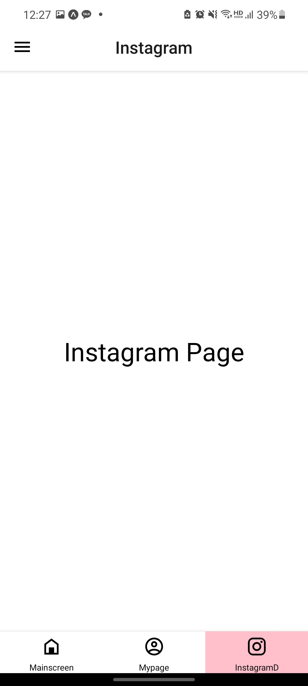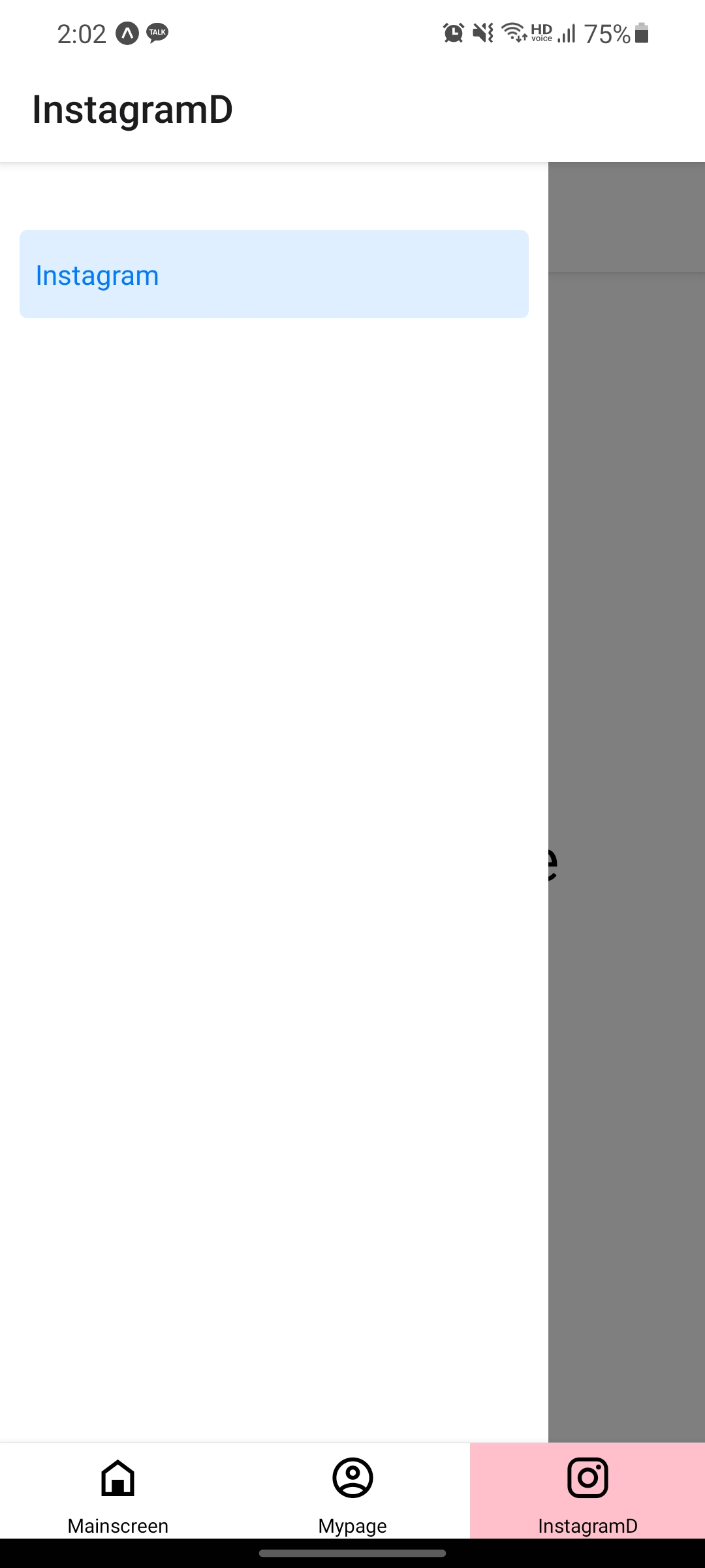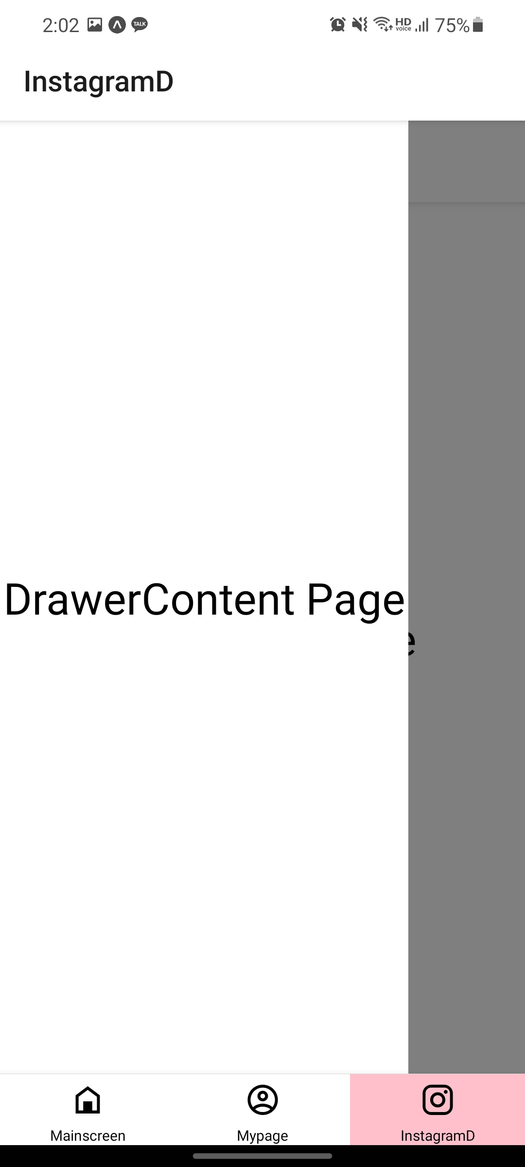 마지막 Instagram tab에서만 Drawer Navigation을 구현하고 싶기 때문에 이곳만 InstaDrawer로 변경해준다. (name은 구현되는 페이지 내부의 이름?과 중복 된다고 warning이 떠서 일단 임시로 'InstagramD'라고 해뒀다.)