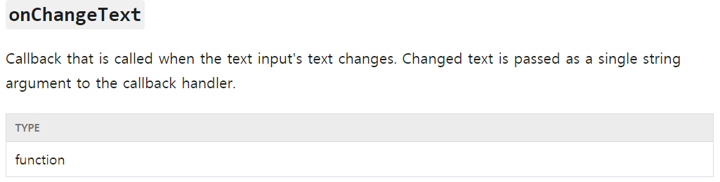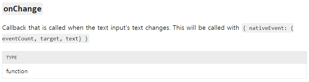 onChange 속성 : TextInput 컴포넌트에 입력된 텍스트가 변경될 때 호출된다. 그리고 호출되는 함수에 다음과 같은 형태로 인자를 전달한다.