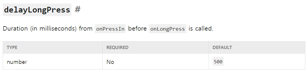 만약 onLongPress가 호출되는 시간을 조절하고 싶다면 delayLongPress 값을 조절하면 된다.